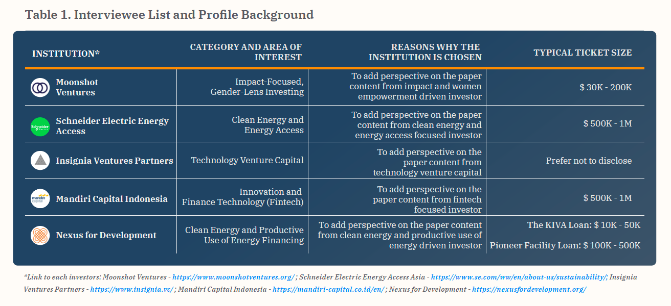 This paper utilized a systematic literature review with the support of primary data collected through in-depth interviews with five different investors with distinguishable categories and areas of interest to acquire a broader perspective on the clean energy investment sector in Indonesia. Additional insights were gathered from an internal Fireside Chat event held by New Energy Nexus Indonesia. The timeframe of the data collection was between April to May 2022.